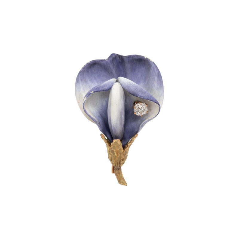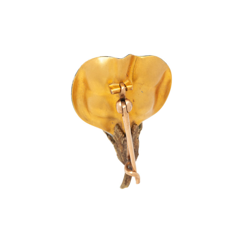 Consisting of polychrome enamel petals, containing one old mine cut diamond. Mounted in yellow gold. 1 1/8 inches x 3/4 inch.