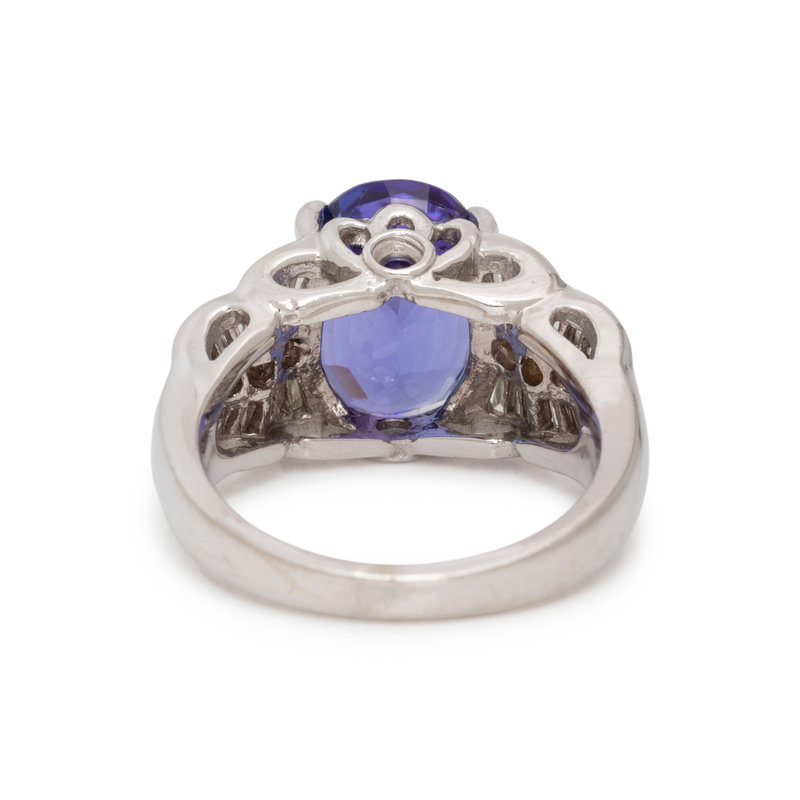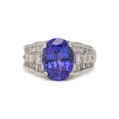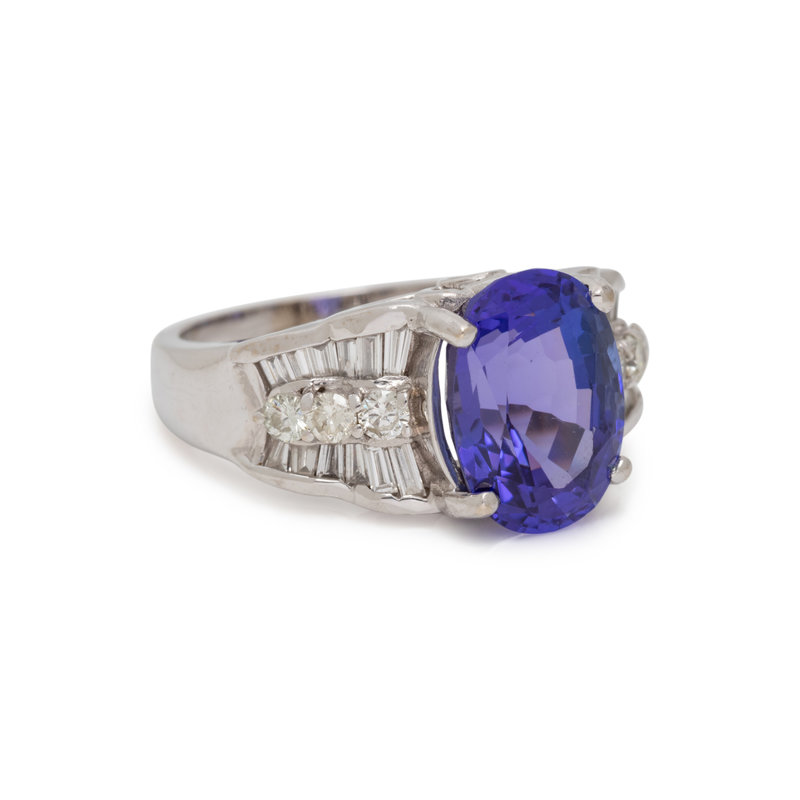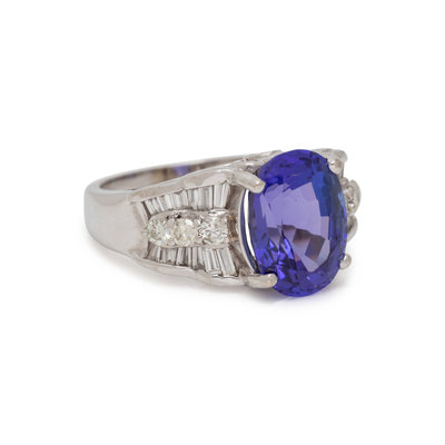 Containing one oval mixed cut tanzanite measuring approximately 11.95 x 8.70 x 6.60 mm, six round brilliant and 24 straight and tapered baguette cut diamonds weighing approximately 0.95 carat total. Mounted in white gold. Ring size 6 3/4.