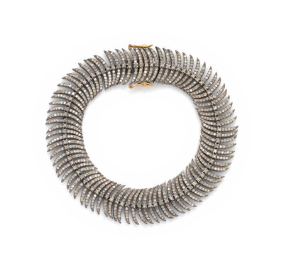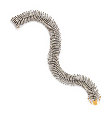 In a fishbone motif, containing numerous single cut diamonds. Mounted in silver and yellow gold. 7 inches long.