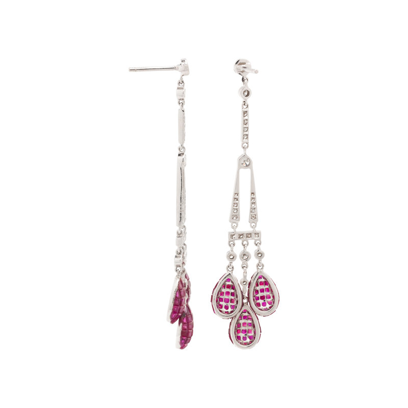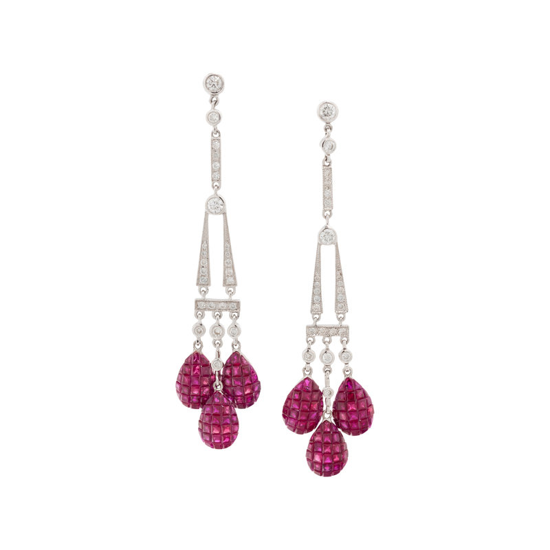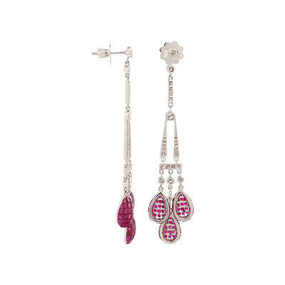 Containing numerous invisibly set ruby drops and 50 round brilliant cut diamonds weighing approximately 0.40 carat total. Mounted in white gold. 2 5/8 inches long.