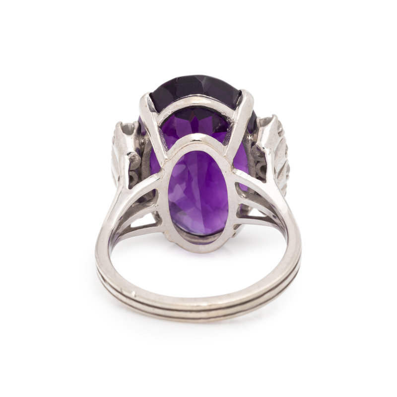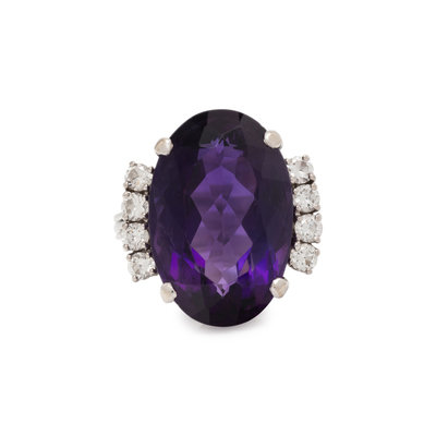 Containing one oval mixed cut amethyst measuring approximately 19.75 x 13.00 x 9.10 mm and eight round brilliant cut diamonds weighing approximately 0.50 carat total. Mounted in white gold. Ring size 7 1/4.