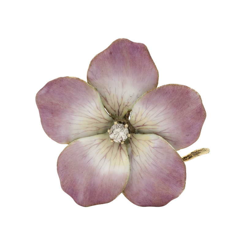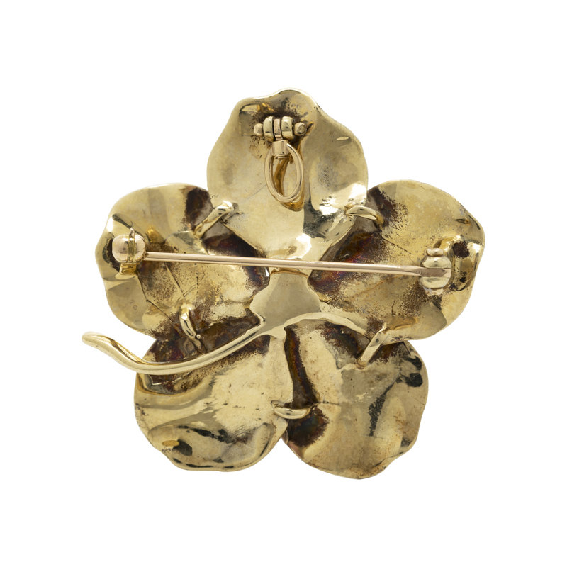 Consisting of matte polychrome enamel petals containing one round brilliant cut diamond weighing approximately 0.30 carat. Mounted in yellow gold. 1 1/2 inches wide.