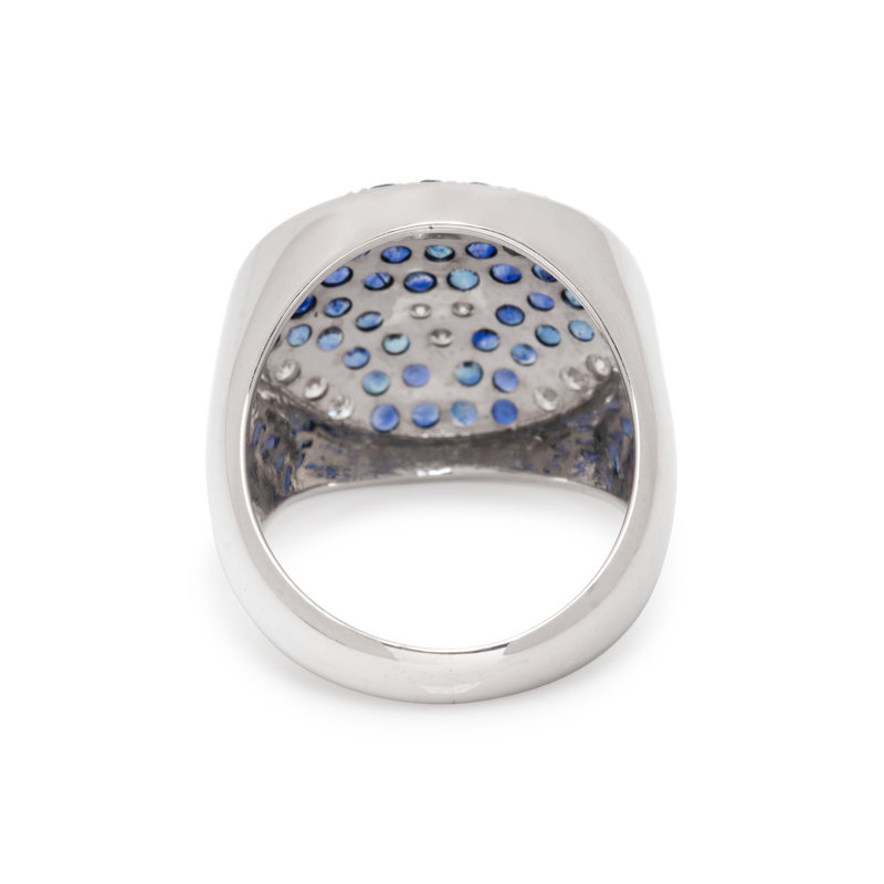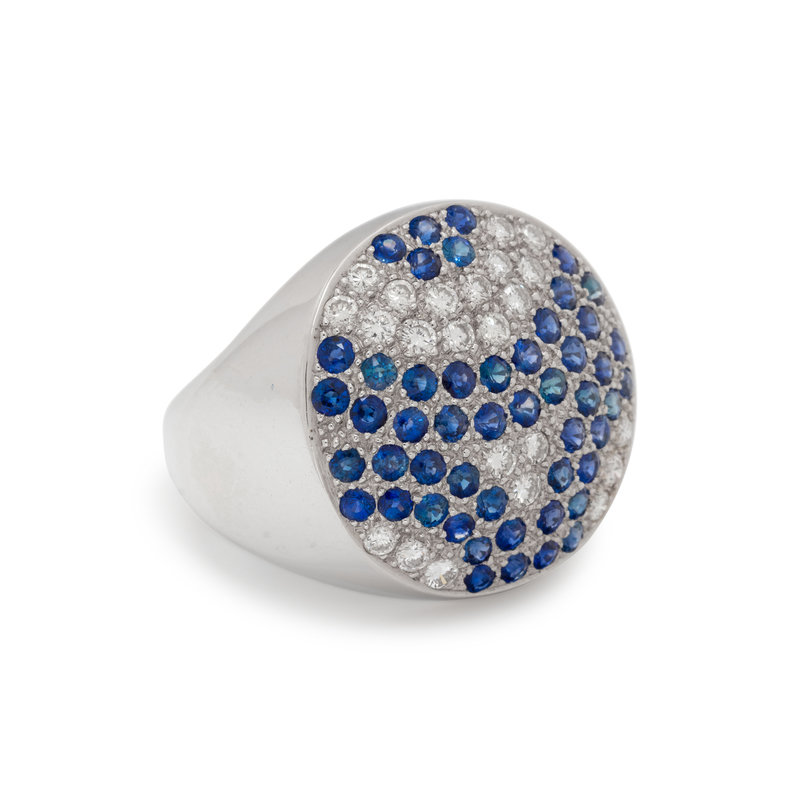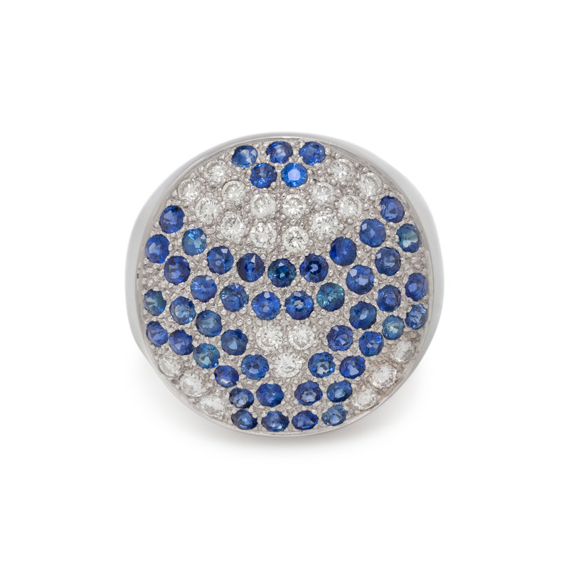 Containing 23 round brilliant cut diamonds weighing approximately 0.45 carat total and 50 round mixed cut sapphires. Mounted in white gold. Ring size 7.