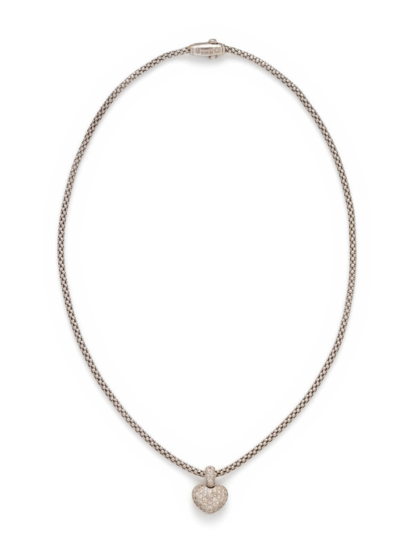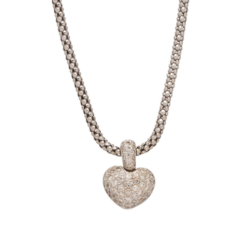 Consisting of a Chimento popcorn link chain suspending a heart pendant containing 70 round brilliant cut diamonds weighing approximately 1.15 carat total. 17 inches long.