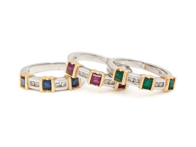 Consisting of a ring containing three square step cut sapphires and four round brilliant cut diamonds, a ring containing three square step cut emeralds and four round brilliant cut diamonds, together with a ring containing three square step cut rubies and four round brilliant cut diamonds. Mounted in bicolor gold. Ring sizes 6 1/2 and 6 3/4.