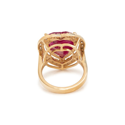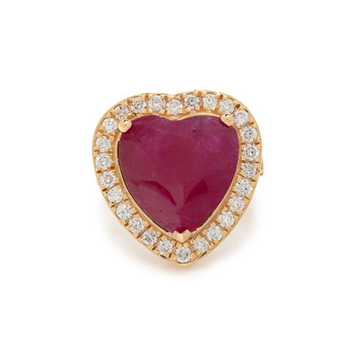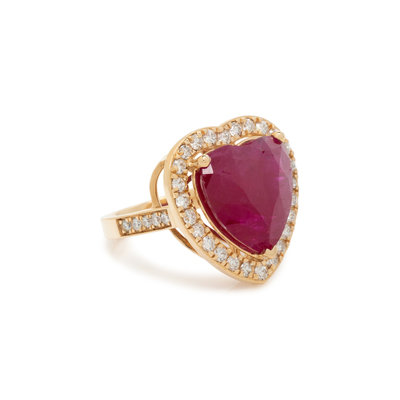 Containing one heart shaped ruby measuring approximately 15.00 x 14.50 mm and 36 round brilliant cut diamonds weighing approximately 1.00 carat total. Mounted in yellow gold. Ring size 7.