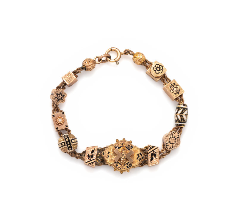 Containing 11 yellow gold and yellow gold-filled charms with black and white enamel detail. 7 1/4 inches long.