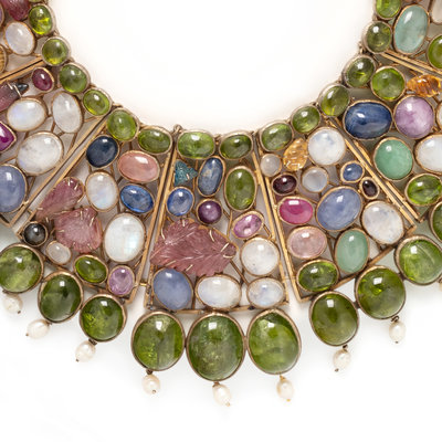 Containing various shape cabochon cut and carved gemstones including tourmaline, sapphire, moonstone and citrine, with 24 cultured pearl drops. 15 1/4 inches long.