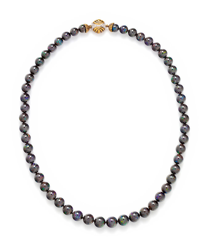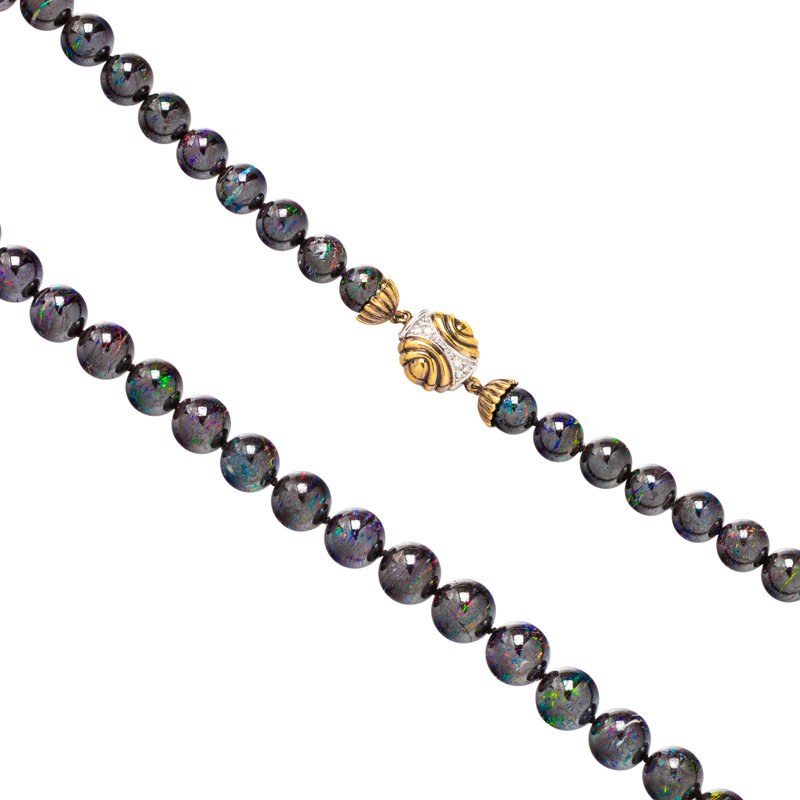 Containing boulder opal beads measuring approximately 7.00-9.00 mm in diameter, strung knotted in a graduating style with bicolor gold and diamond clasp. 17 3/4 inches long.