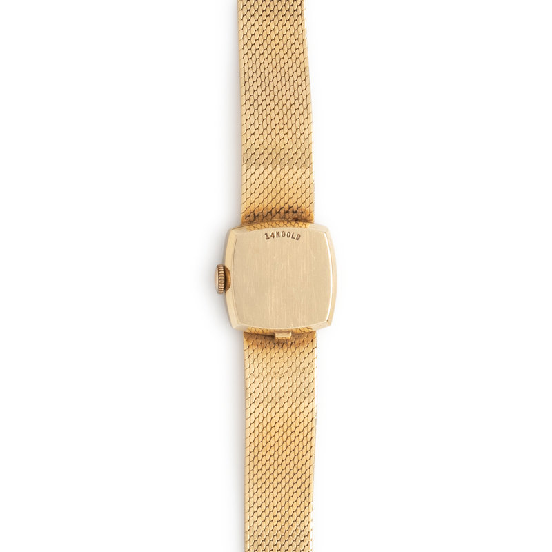 Stamps: Case back: 14K GOLD. Clasp: 14K. Movement: OMEGA WATCH CO 27074223. Inner case back: OMEGA WATCH CO 14K GOLD AA7728-R 517198.