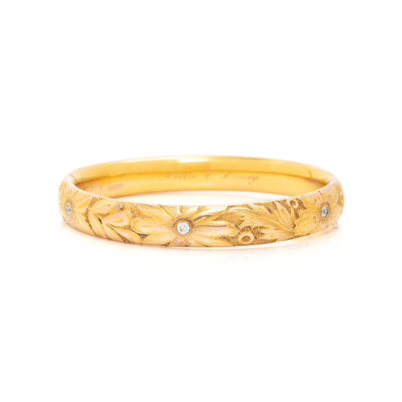 YELLOW GOLD AND DIAMOND FLORAL BANGLE BRACELET
