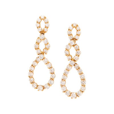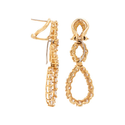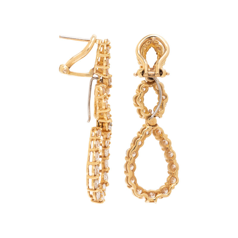 Consisting of earclips containing 14 round brilliant cut diamonds with removable drops containing 42 round brilliant cut diamond weighing approximately 4.50 carats total, posts with clip backs. 1/2 inch-1 3/4 inches long.