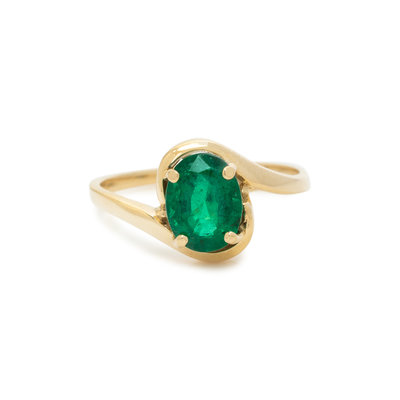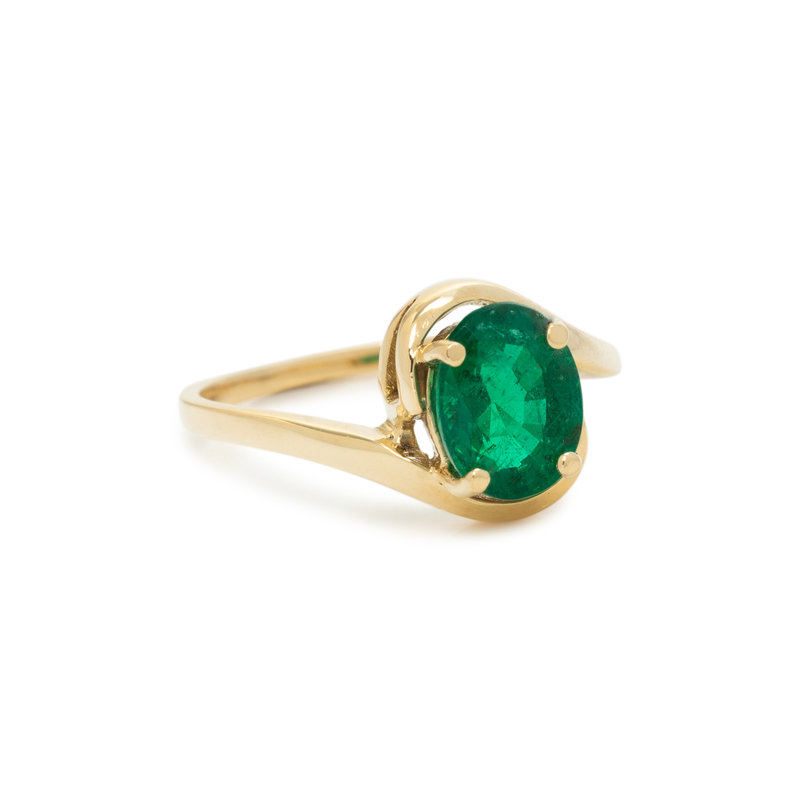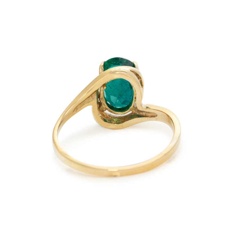 Containing one oval mixed cut emerald measuring approximately 8.10 x 6.10 x 5.00 mm. Mounted in yellow gold. Ring size 6 1/2.