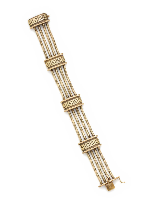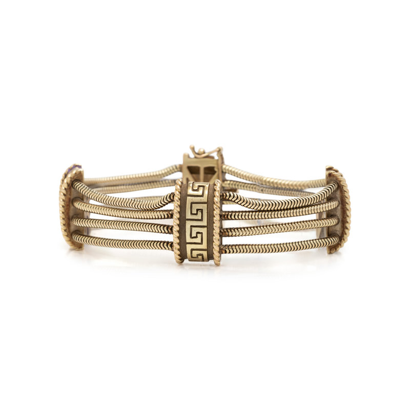 Consisting of four snake link chains intersperse with Greek motif links measuring approximately 22.00 mm wide. 7 1/4 inches long.