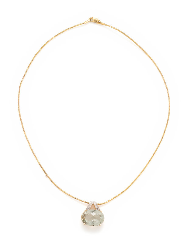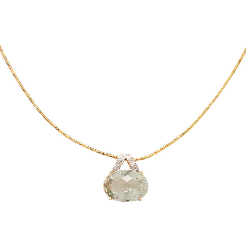 Consisting of a bicolor gold pendant containing one oval checkerboard cut quartz measuring approximately 18.00 x 13.00 x 8.50 mm, suspended from a yellow gold fancy link chain. 16 inches long.
