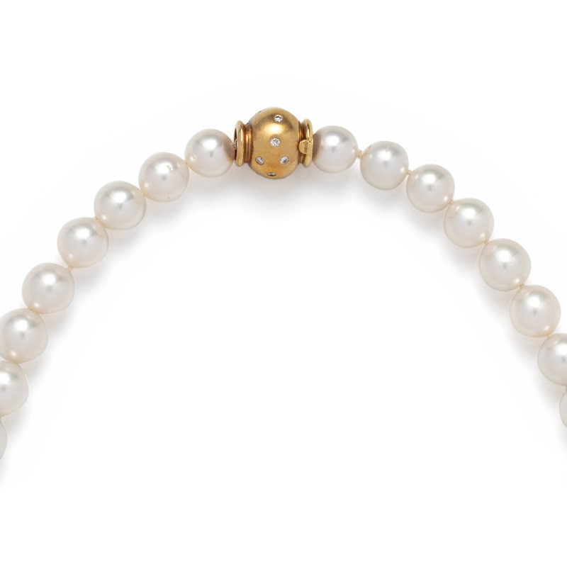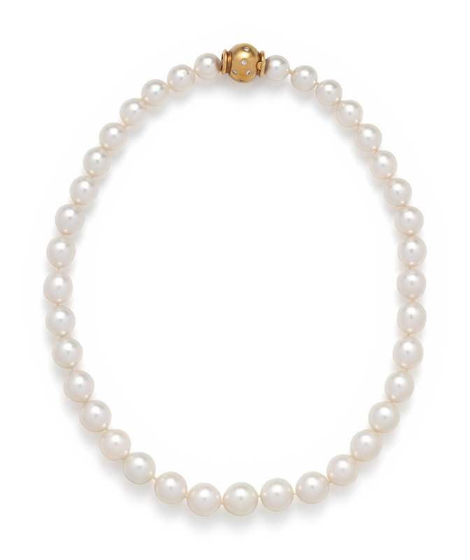 Containing pearls measuring approximately 10.20-12.80 mm in diameter, strung knotted with a yellow gold and diamond clasp. 18 1/2 inches long.