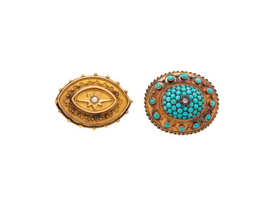 Consisting of a brooch containing round cabochon turquoise and one rose cut diamond, together with a brooch containing one seed pearl. 1 1/4 inches x 1 inch and 1 3/8 inches x 1 inch.