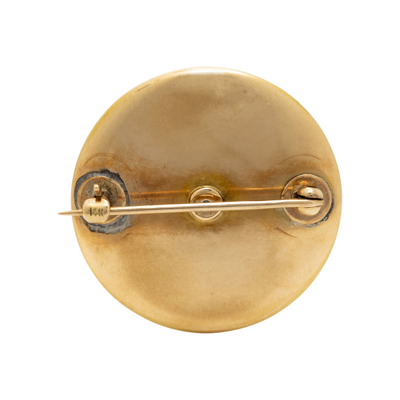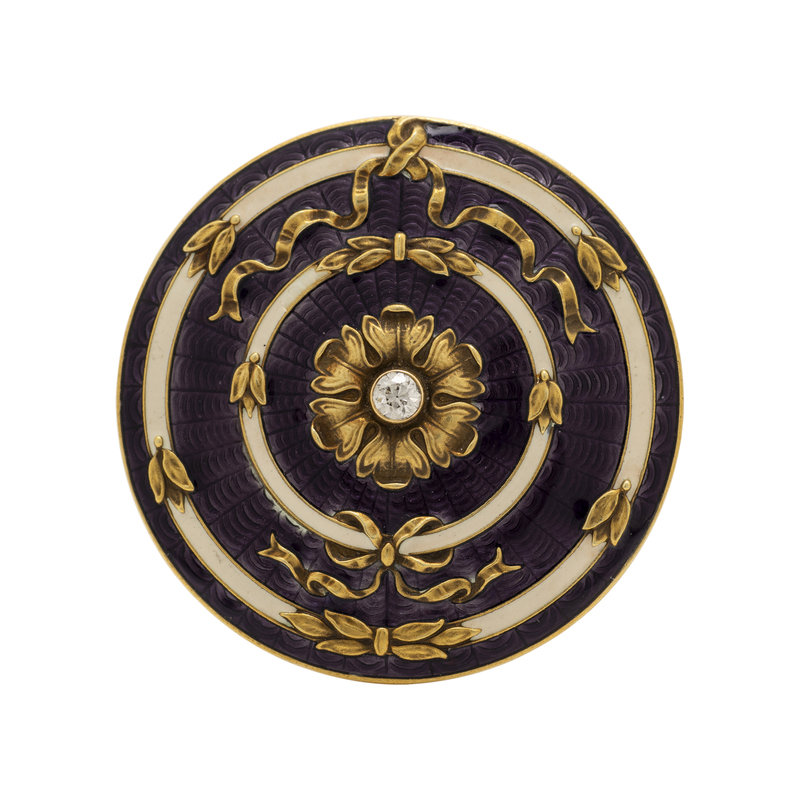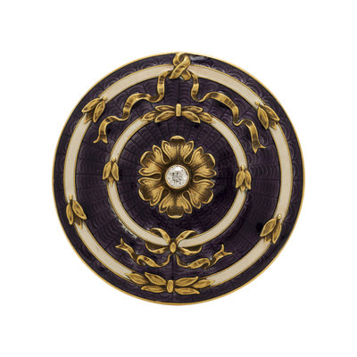 Containing one old European cut diamond with cream enamel and purple guilloché enamel. Mounted in yellow gold. 1 1/4 inches wide.