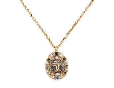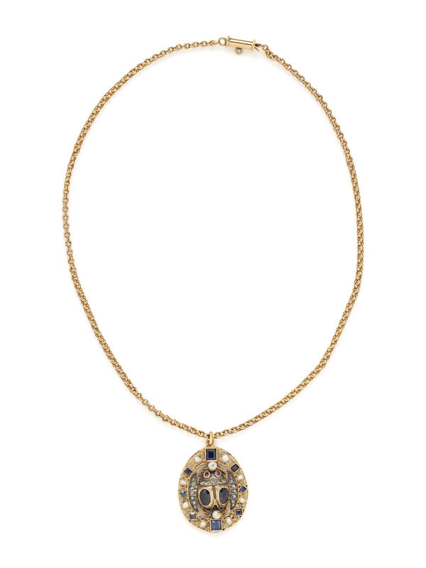 Consisting of a scarab motif pendant containing square step cut and oval mixed cut sapphires, ten pearls (origin not tested), ruby eyes and rose cut diamond detail, suspended from a fancy link chain. Mounted in yellow gold and silver toped gold. 19 1/2 inches long.