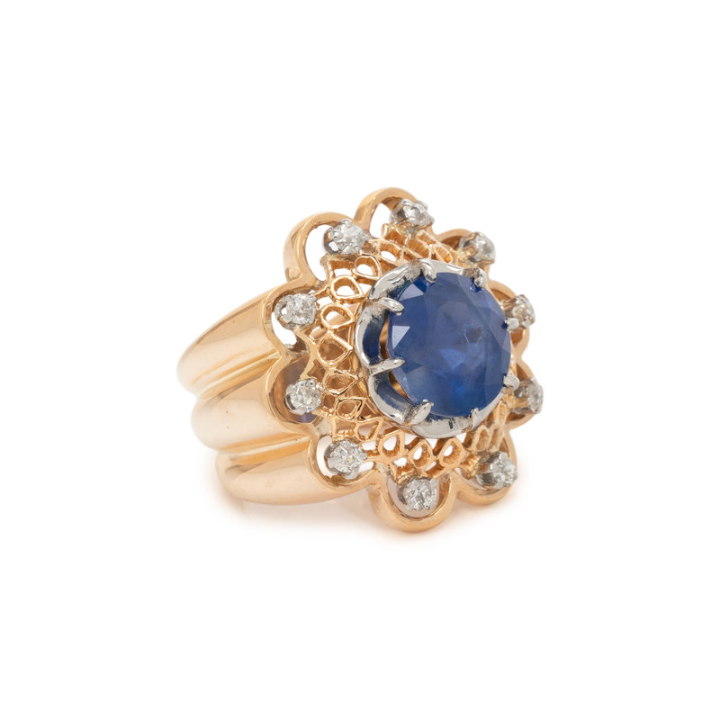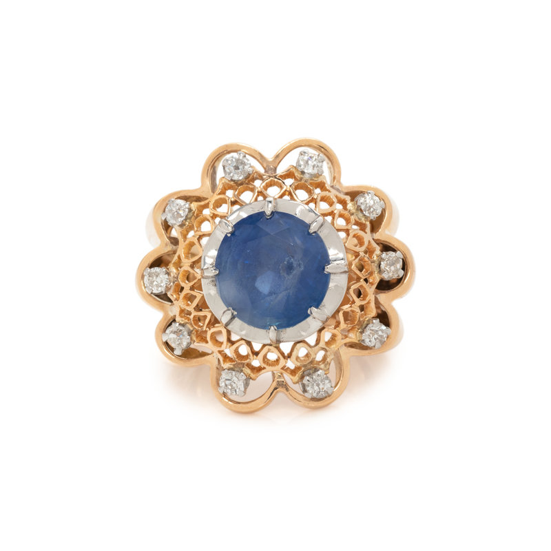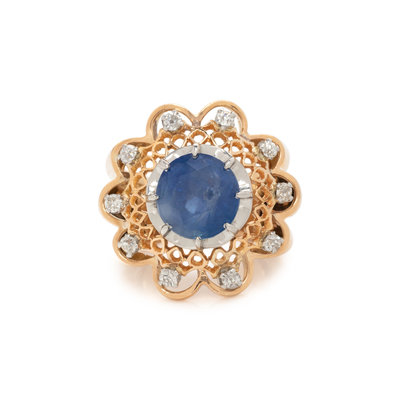 Containing one round mixed cut sapphire measuring approximately 9.85 x 9.70 x 6.95 mm and 10 old European cut diamonds weighing approximately 0.40 carat total. Mounted in bicolor gold. Ring size 5 1/4.