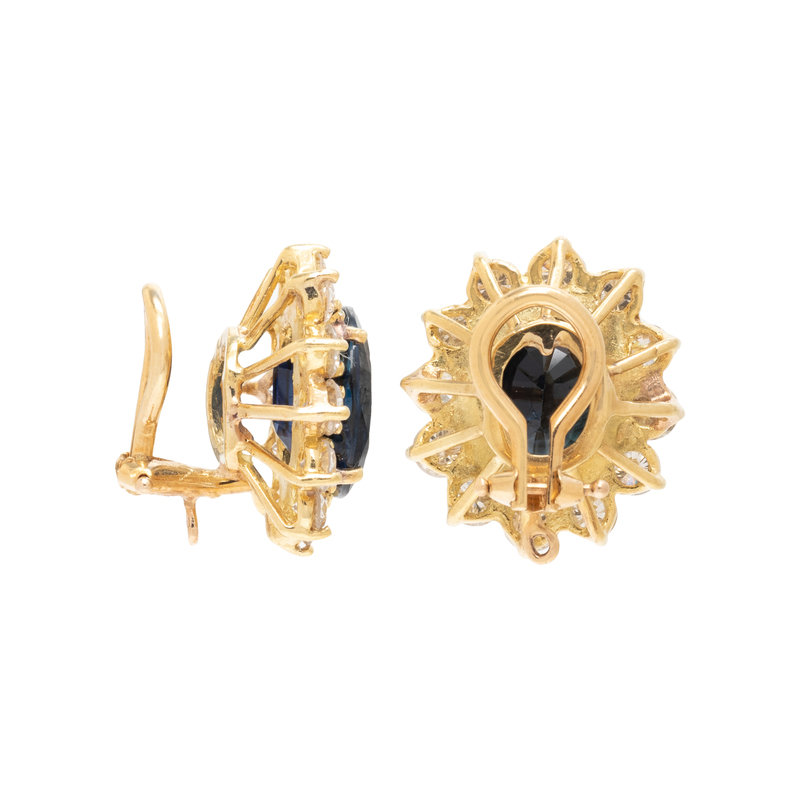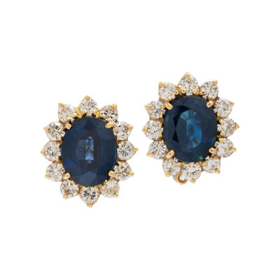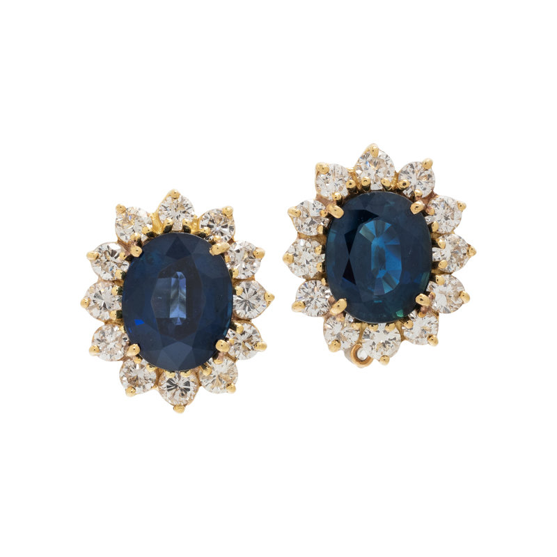 Containing two oval mixed cut sapphires measuring approximately 10.50 x 8.60 x 4.90 and 11.00 x 8.85 x 5.45 mm and 24 round brilliant cut diamonds weighing approximately 2.60 carats total. Mounted in yellow gold. 3/4 inch long.