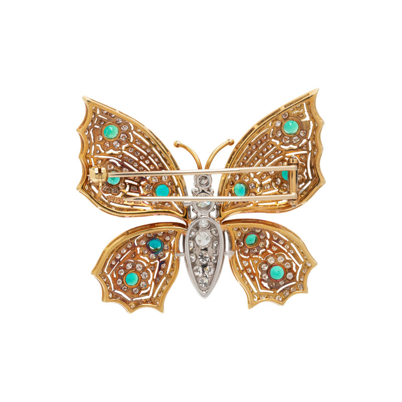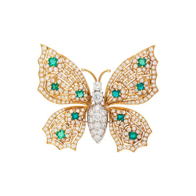 BICOLOR GOLD, DIAMOND AND EMERALD BUTTERFLY BROOCH