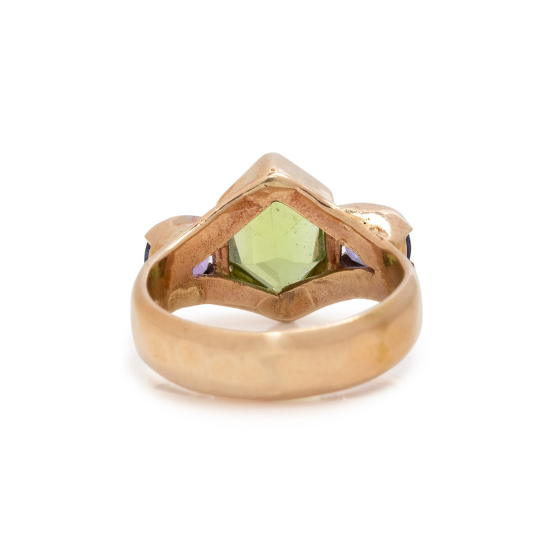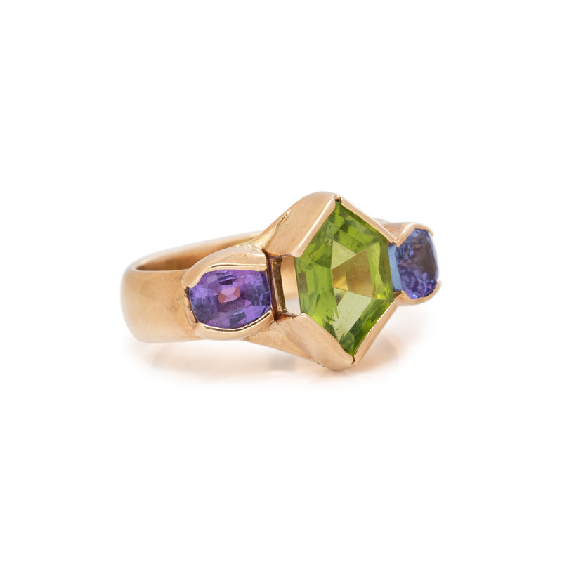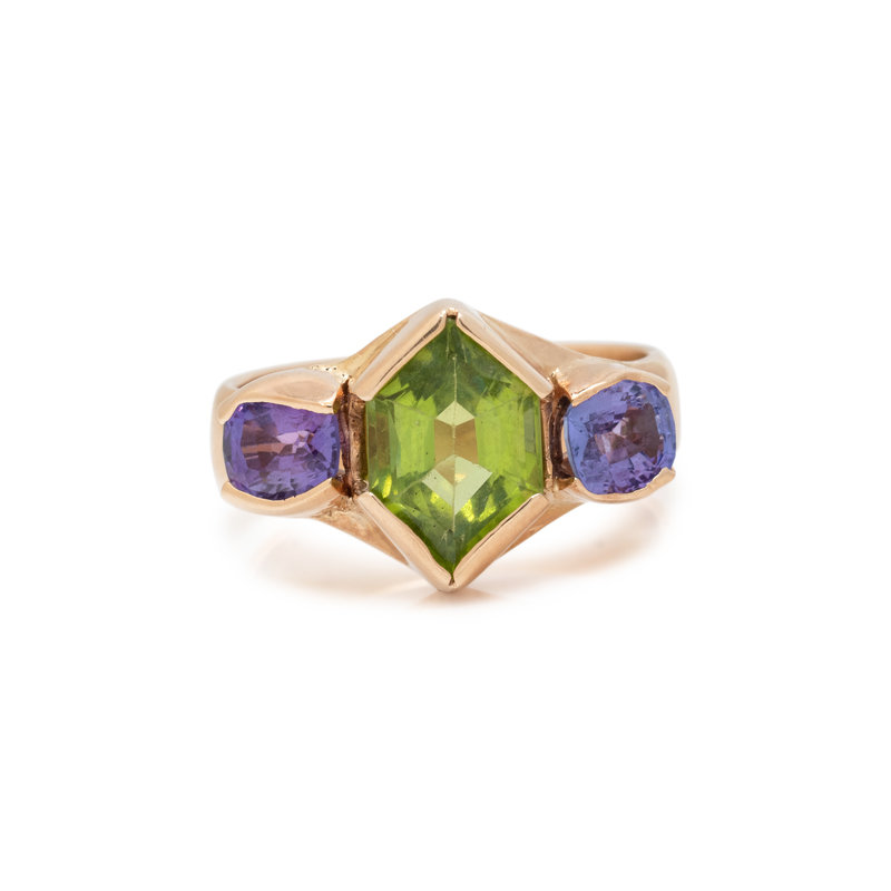 YELLOW GOLD, PERIDOT AND TANZANITE RING