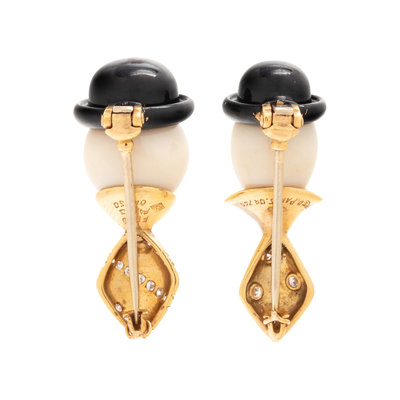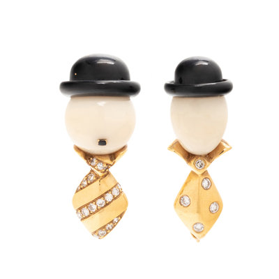 Consisting of white chalcedony heads, black enamel over yellow gold bowler hats and yellow gold and diamond neckties. 1 1/8 inches long.