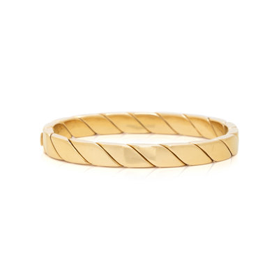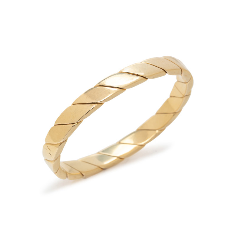 In a flat twisted rope design measuring approximately 7.00 mm wide, hinged with side clasp. 6 1/2 inches inner circumference.