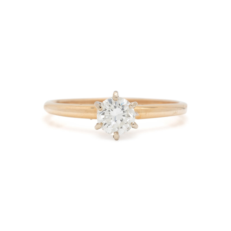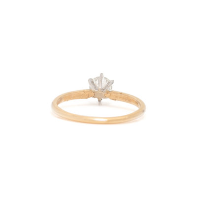 Containing one round brilliant cut diamond weighing approximately 0.50 carat. Mounted in bicolor gold. Ring size 6 1/2.