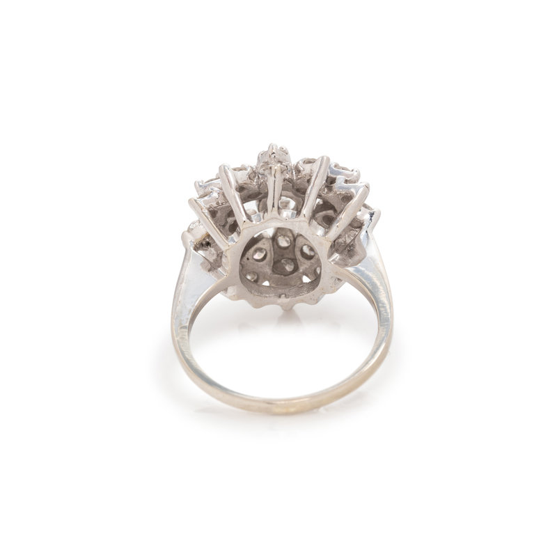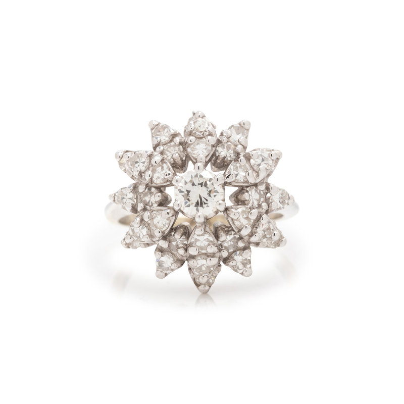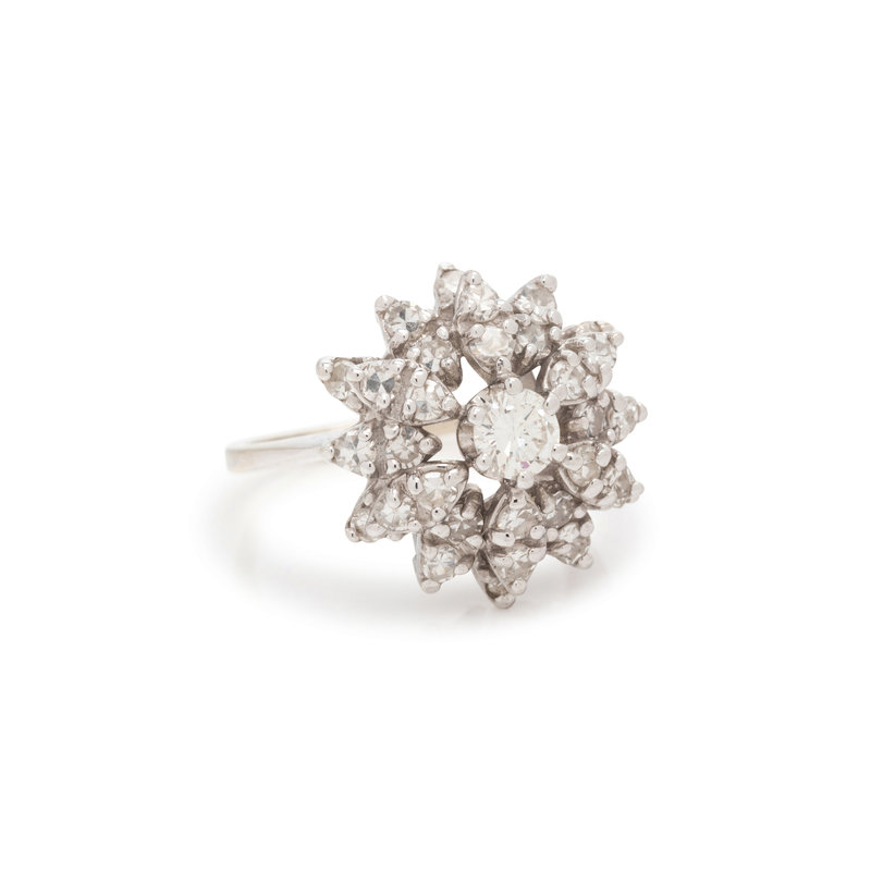 Containing one round brilliant cut diamond weighing approximately 0.30 carat and 30 single cut diamonds weighing approximately 1.00 carat total. Mounted in white gold. Ring size 6.