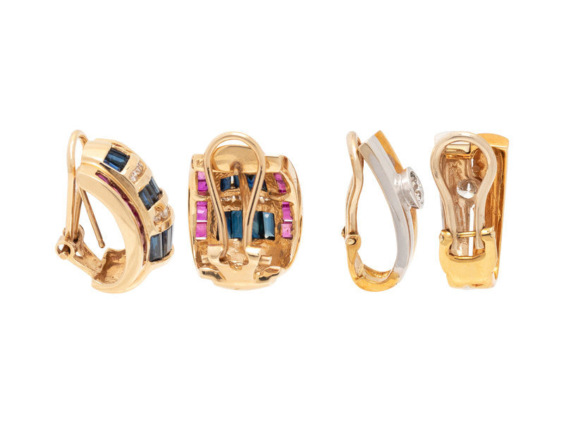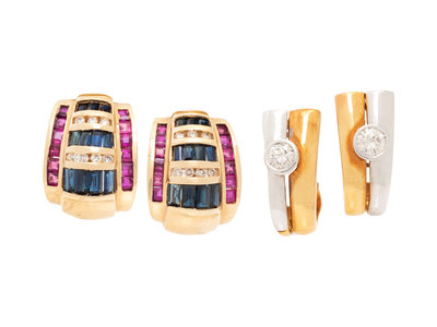 Consisting of a pair of bicolor gold earclips containing two round brilliant cut diamonds weighing approximately 0.60 carat total, together with a pair of yellow gold earclips containing 14 round brilliant cut diamonds, 22 rectangular step cut sapphires and 24 square step cut rubies. 3/4 and 5/8 inch long.