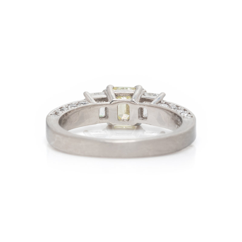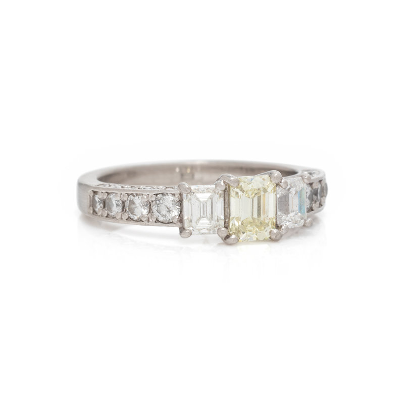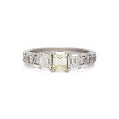 Containing one emerald cut yellow diamond (origin of color not tested) weighing approximately 0.50 carat, two emerald cut diamonds and eight round brilliant cut diamonds weighing approximately 0.60 carat total. Mounted in platinum. Ring size 6.