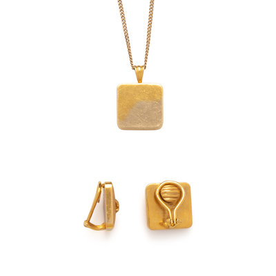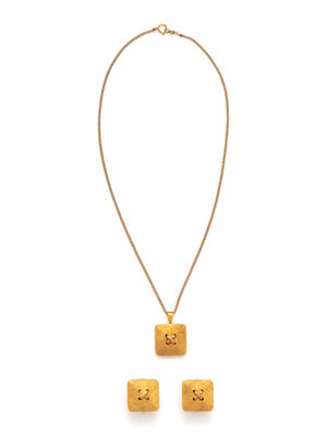 Consisting of a curb link chain suspending a button motif pendant with Florentine finish, together with a pair of earclips. Necklace: 14 inches long. Earclips: 5/8 inch long.