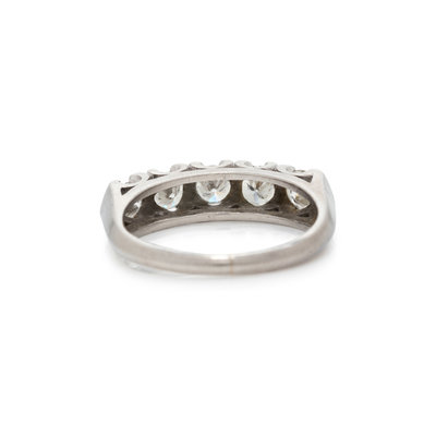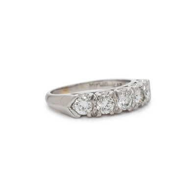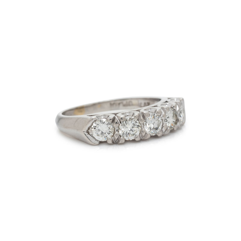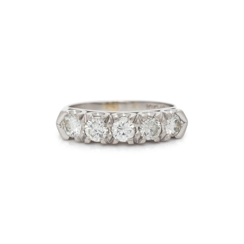 Containing five round brilliant cut diamonds weighing approximately 1.00 carat total. Mounted in platinum. Ring size 6 3/4.