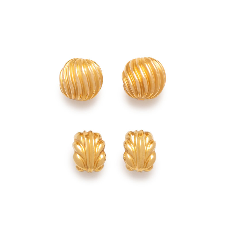 Consisting of a pair of hollow round high polish and brushed gold earclips, together with a pair of high polish gold earclips, posts with clip backs. 7/8 inch long.