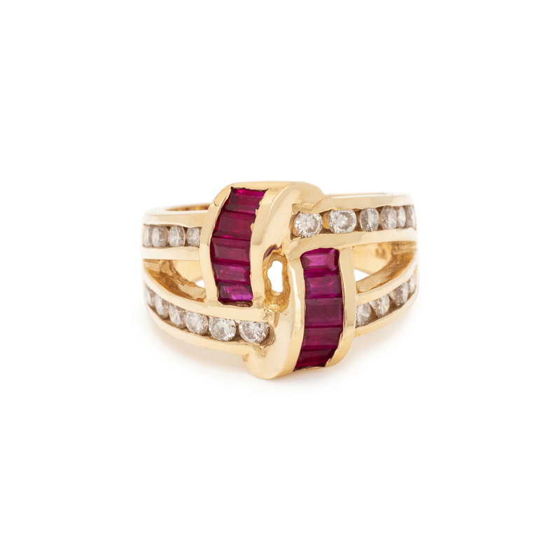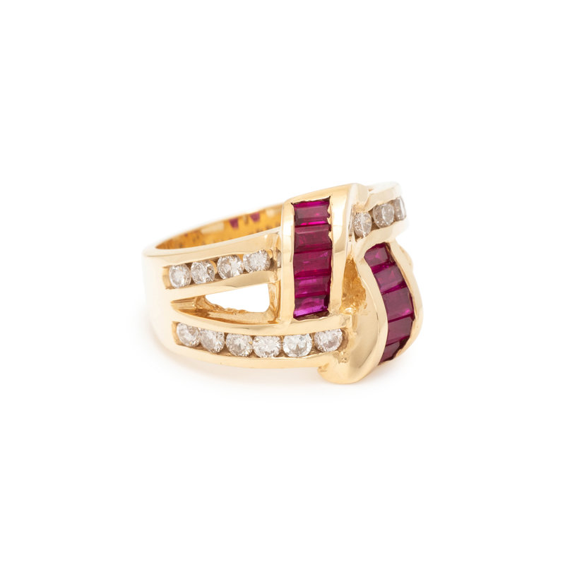 Containing 10 rectangular step cut synthetic rubies and 20 round brilliant cut diamonds weighing approximately 1.00 carat total. Ring size 7 1/2.