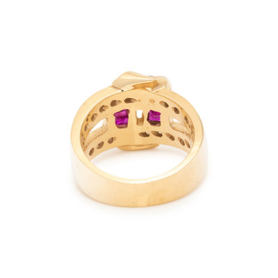 YELLOW GOLD, SYNTHETIC RUBY AND DIAMOND RING