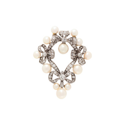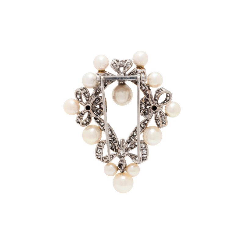 Containing 12 cultured pearls and numerous old European and single cut diamonds weighing approximately 3.00 carats total. Mounted in platinum. 2 1/4 x 1 3/4 inches.