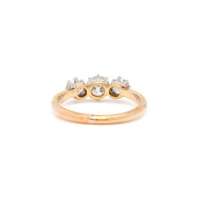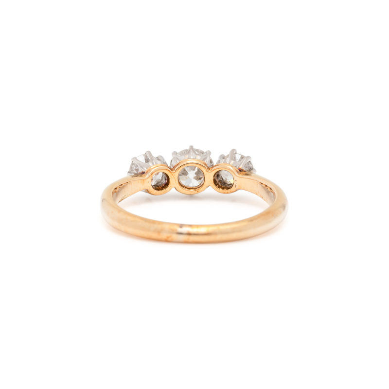 Containing three old European cut diamonds weighing approximately 0.65 carat total. Mounted in bicolor gold. Ring size 5 1/4.