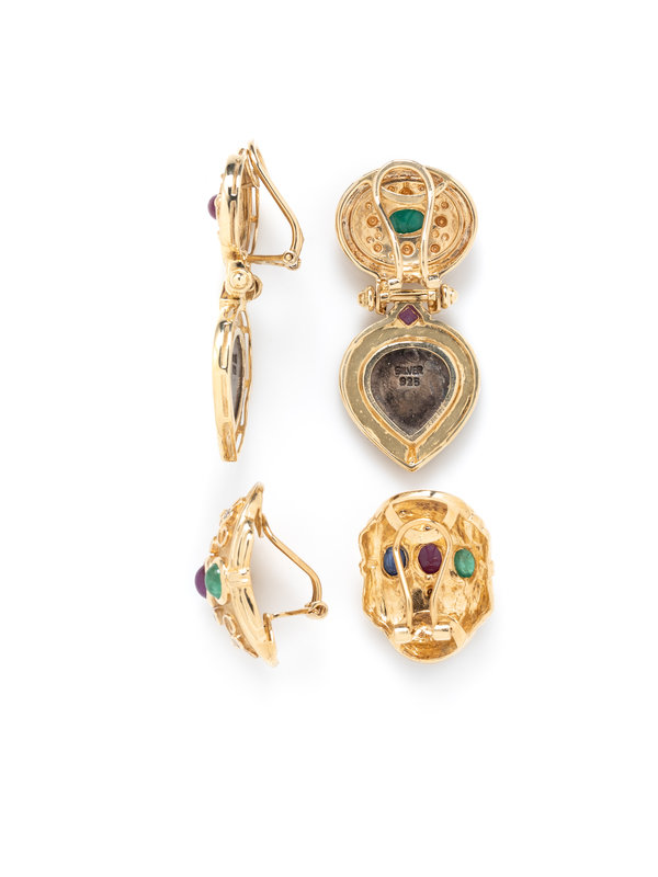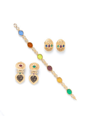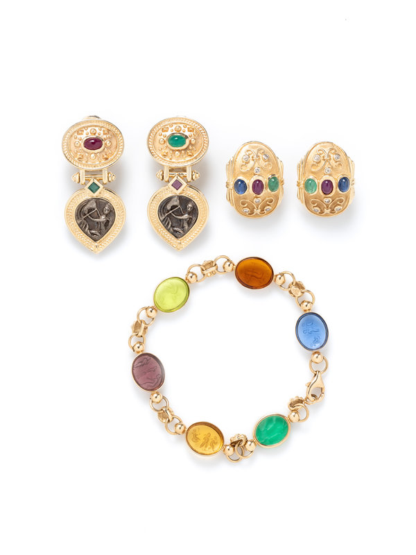 Consisting of pair of earclips containing one oval cabochon emerald, one oval cabochon ruby, one square step cut emerald, one square step cut ruby and two silver coins, a pair of earclips containing two oval cabochon sapphires, two oval cabochon rubies, two oval cabochon emeralds and 12 round brilliant cut diamonds, together with bracelet containing yellow gold and carved glass intaglio links. Earclips: 1 3/4 inches and 1 inch long. Bracelet: 7 1/2 inches long.