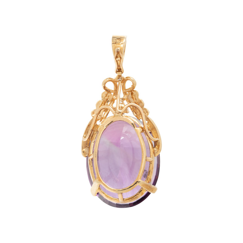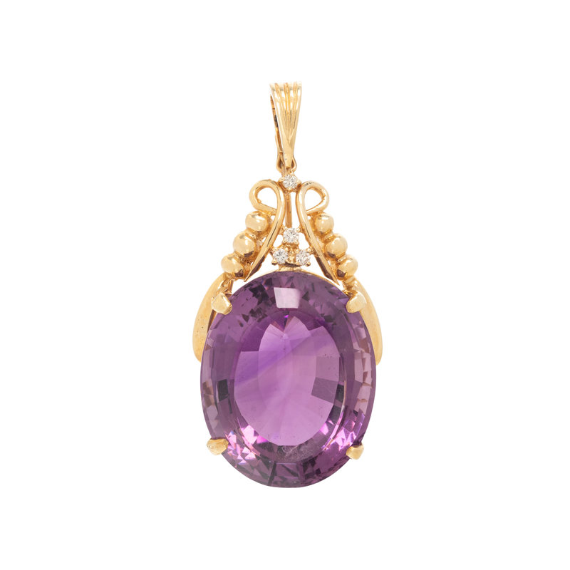 Containing one oval mixed cut amethyst measuring approximately 18.00 x 22.90 x 12.00 mm and four round brilliant cut diamonds. Mounted in yellow gold. 1 5/8 inches long.