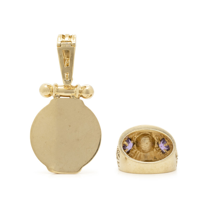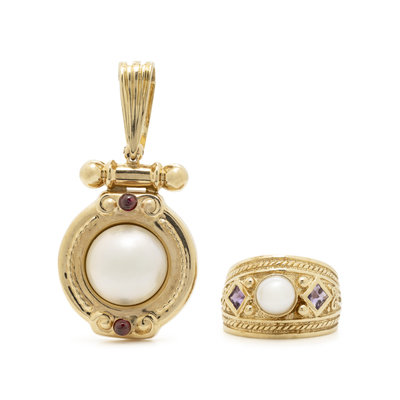 Consisting of a ring containing one cultured pearl measuring approximately 6.80 mm in diameter and two square step cut amethysts, together with a pendant containing one mabe pearl measuring approximately 14.00 mm in diameter and two round cabochon tourmalines. Ring size 7. Pendant: 2 inches long.