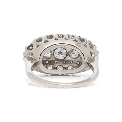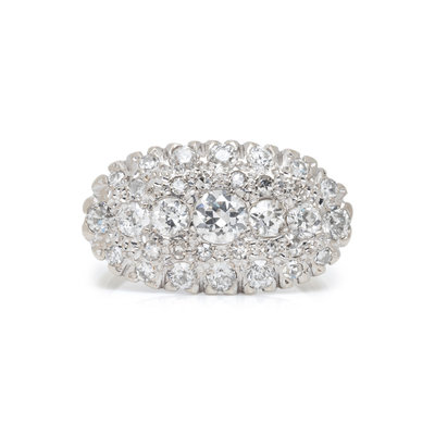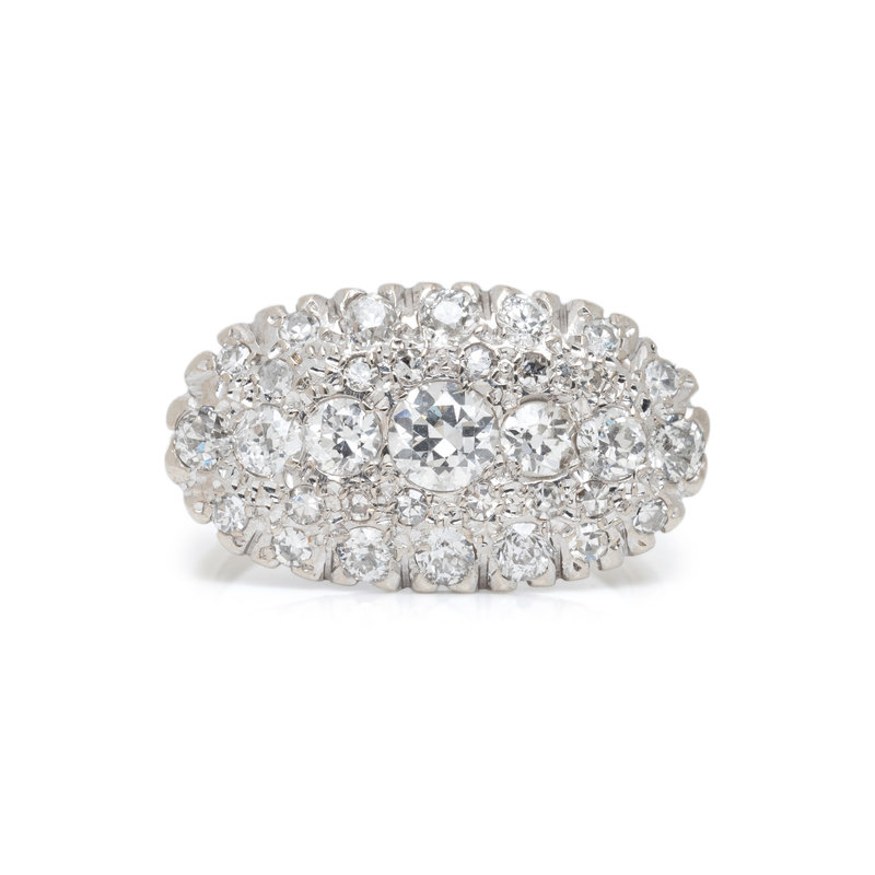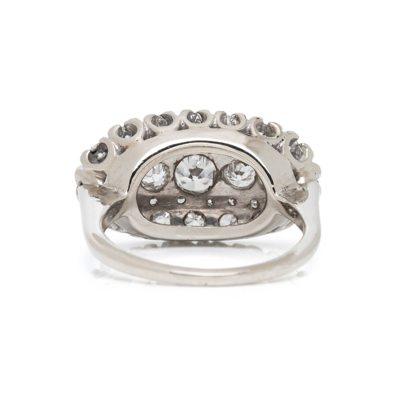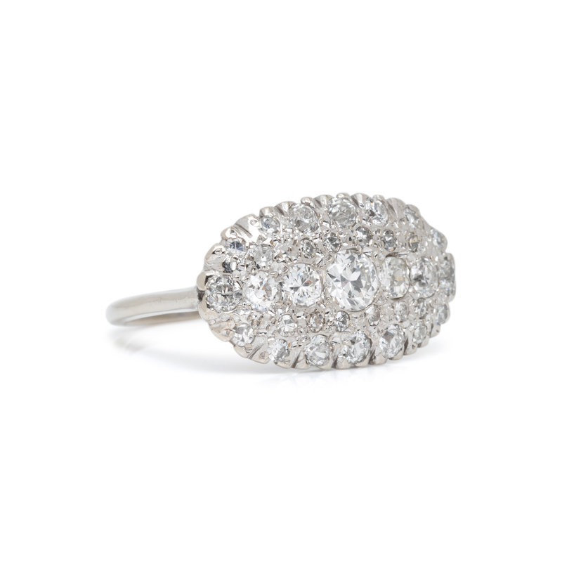 Containing 33 old European and single cut diamonds weighing approximately 1.75 carats total. Mounted in white gold. Ring size 7 1/4.