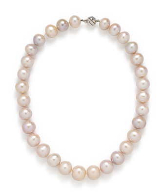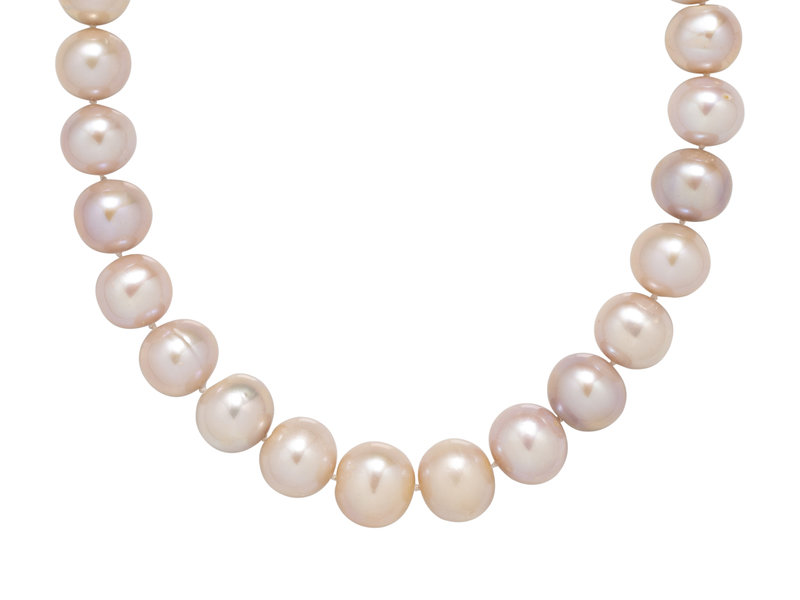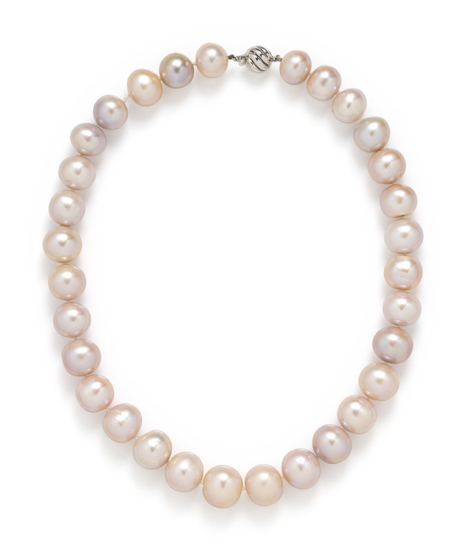 Consisting of pink pearls measuring approximately 13.40-15.70 mm in diameter, strung knotted with white gold clasp. 17 1/2 inches long.