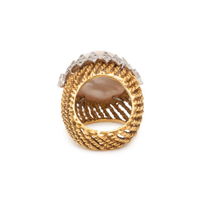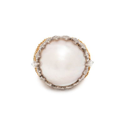 Containing one mabe pearl measuring approximately 20.00 mm in diameter, two marquise cut and 64 single cut diamonds weighing approximately 1.00 carat total. Mounted in bicolor gold. Ring size 6 1/2.
