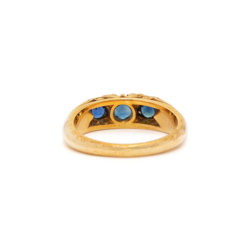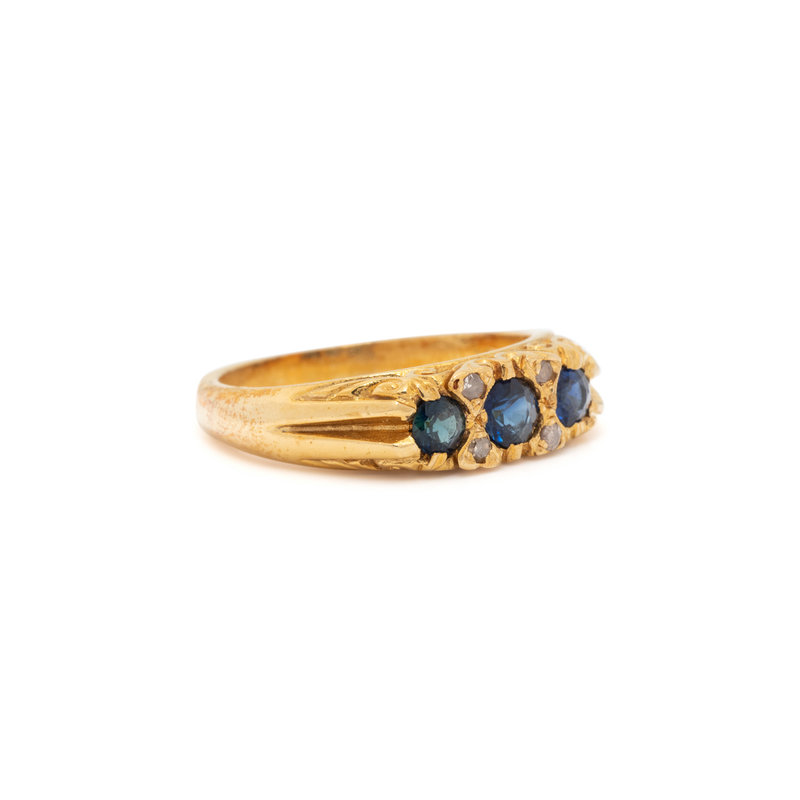 Containing three round mixed cut synthetic sapphires and four single cut diamonds. Ring size 6 3/4.