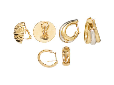 Consisting of a pair of yellow gold hoops, a pair of bicolor gold hoops and a round pair. 1 inch, 1 1/4 inches and 1 inch long.