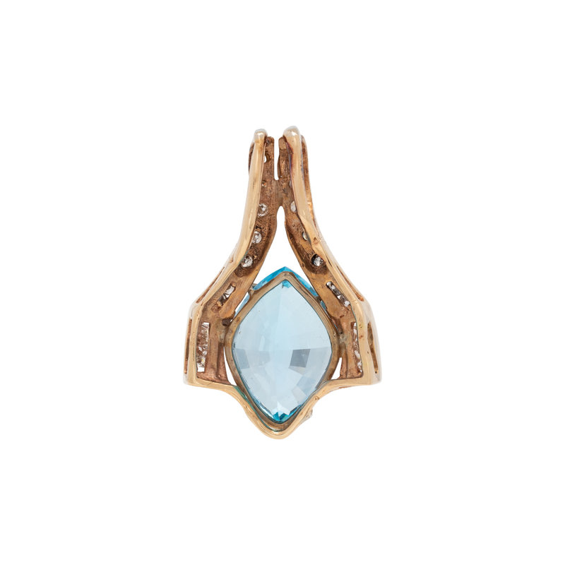 Consisting of a blue topaz measuring approximately 18.00 x 13.00 mm, 14 round brilliant and four princess cut diamonds weighing approximately 0.80 carat total. 1 3/8 inches long.