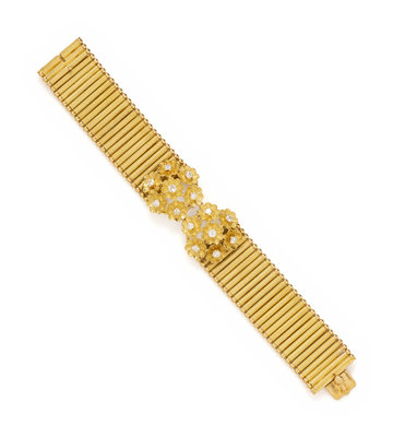 Consisting of vertical links measuring approximately 20.00 mm wide with center floral motif containing 14 round brilliant cut diamonds weighing approximately 0.40 carats total. 6 1/2 inches long.